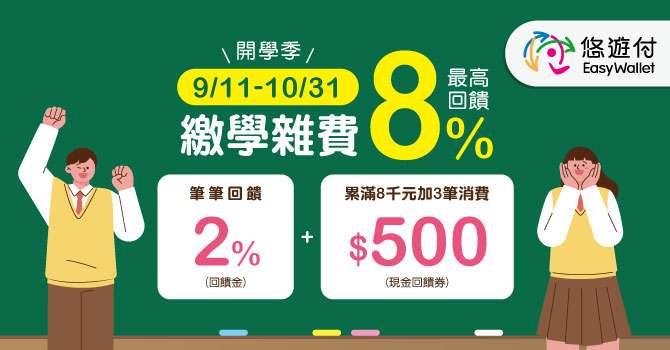 3.活動內容:活動期間當月使用悠遊付每筆扣款享2%悠遊 付回饋金,另累積消費新臺幣(以下同)8,000元加3筆 消費即回饋500元現金回饋券,活動期間每戶最高回饋8% 悠遊付回饋金(或回饋券)