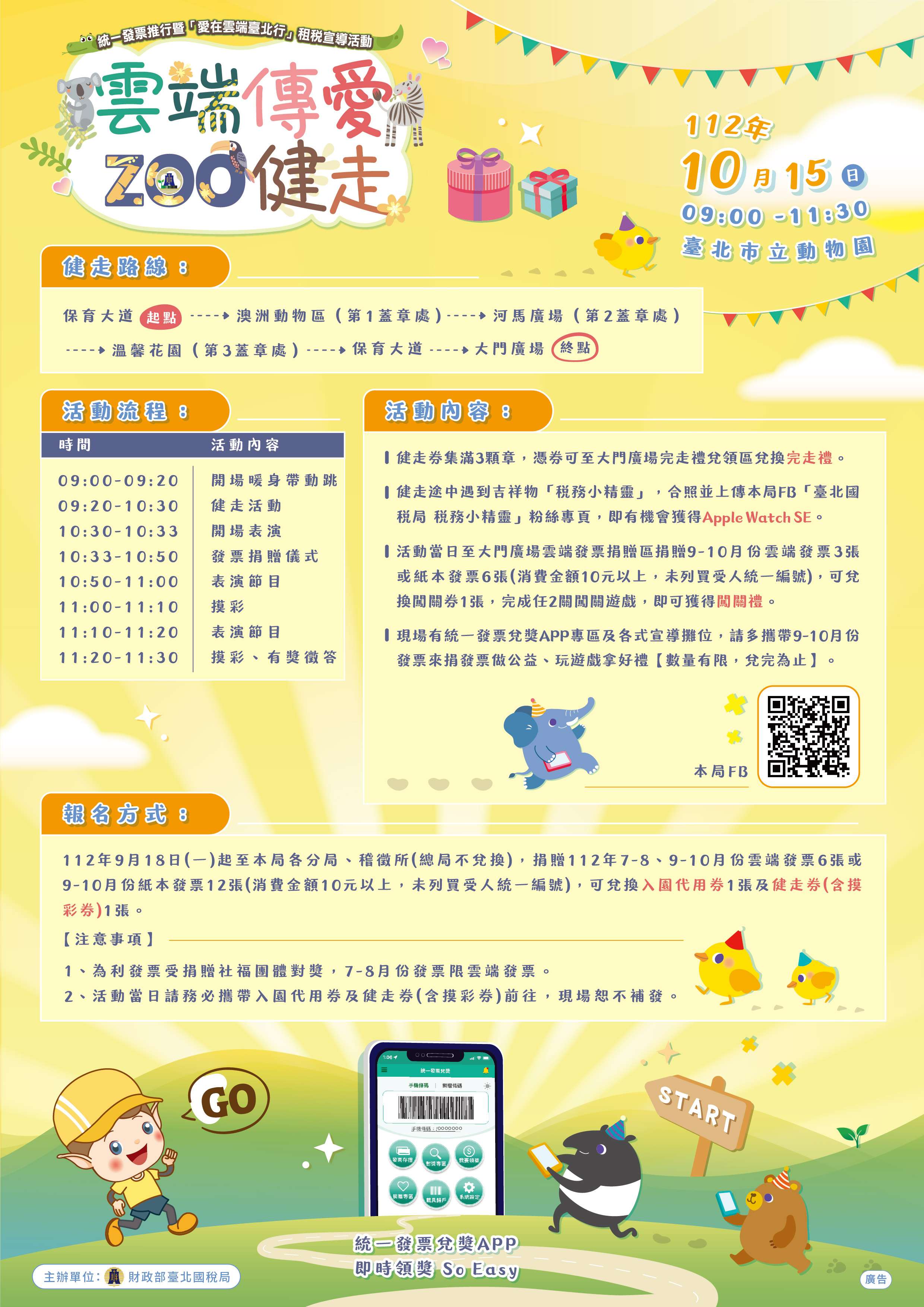 財政部臺北國稅局表示,為鼓勵民眾購物消費使用載具儲存雲端發票,運用財政部統一發票兌獎APP設定載具歸戶、領獎帳戶等功能,以提升發票兌領獎自動化作業效益,於112年10月15日(星期日)假臺北市立動物園舉辦統一發票推行暨「雲端傳愛 ZOO健走」租稅宣導活動(海報如附件),邀請您一同健康出遊。