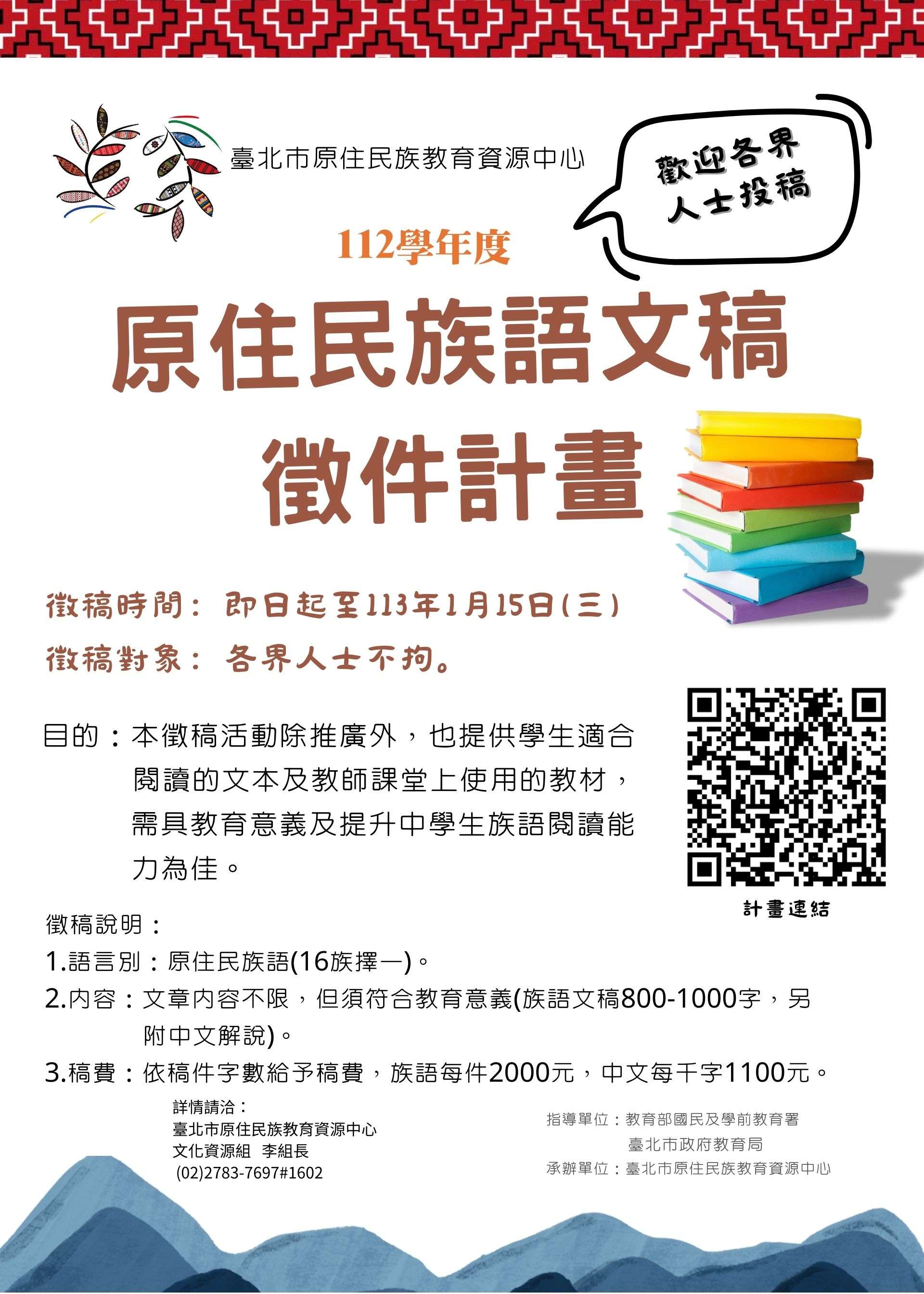 一、依據教育部國民及學前教育署補助112年度臺北市原住民族