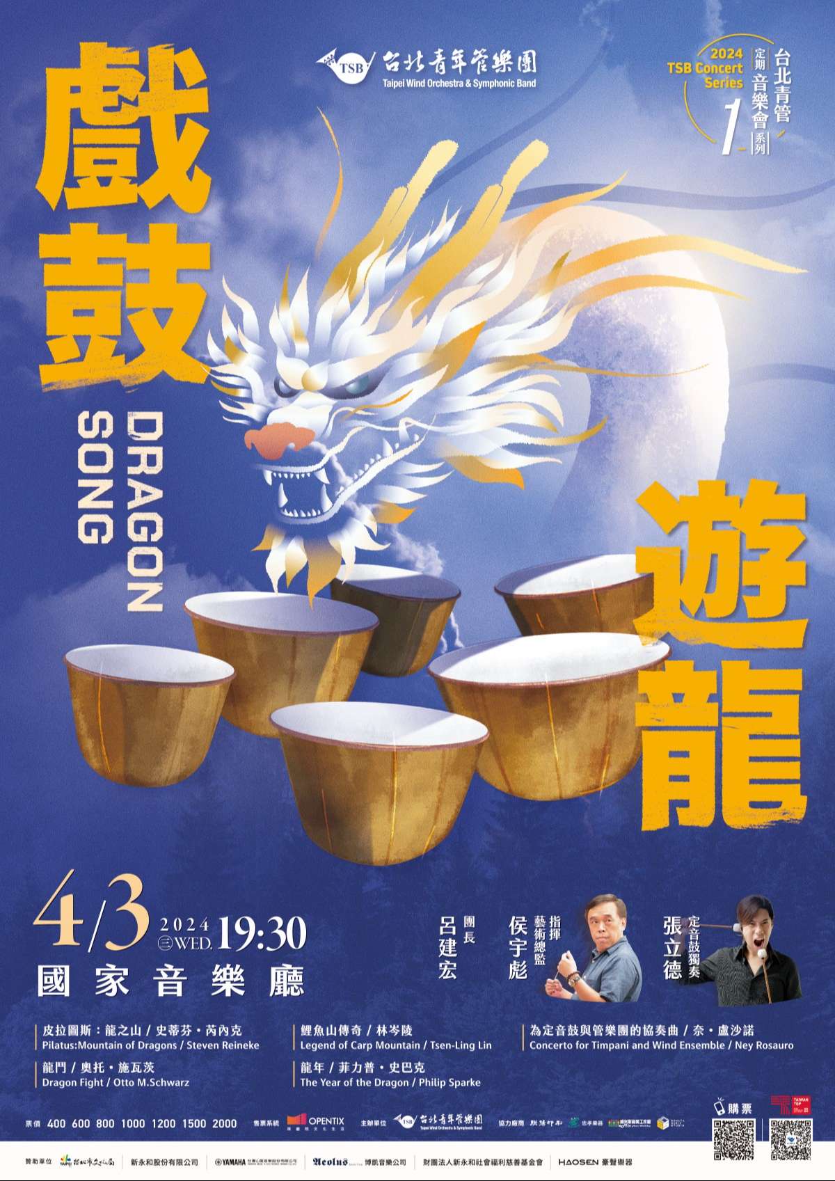 一、2024台北青管定期音樂會系列I,由侯宇彪教授指揮台北青年管樂團演出;帶來多首與東西方神獸龍有關之樂曲,氣勢磅礡。並邀請廣州交響樂團定音鼓首席張立德擔任協奏曲獨奏,精彩可期。
