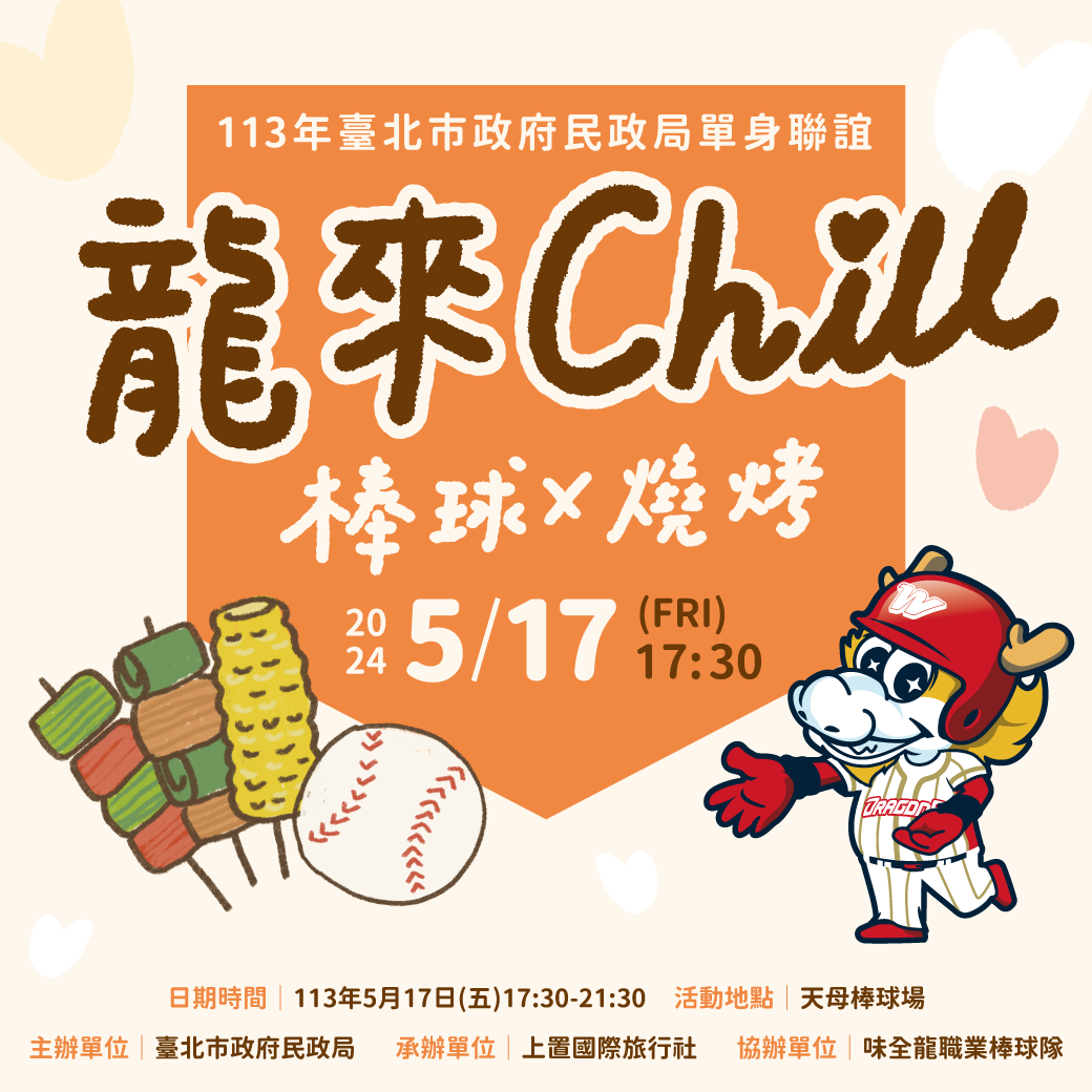 說明:「龍來chill」棒球燒烤主題聯誼,訂於113年5月17日下午5點30分在天母棒球場辦理,凡對棒球主題有興趣、25-45歲單身朋友皆可報名。詳情請參閱臺北市鼓勵婚育專區:https://loveactually.gov.taipei/