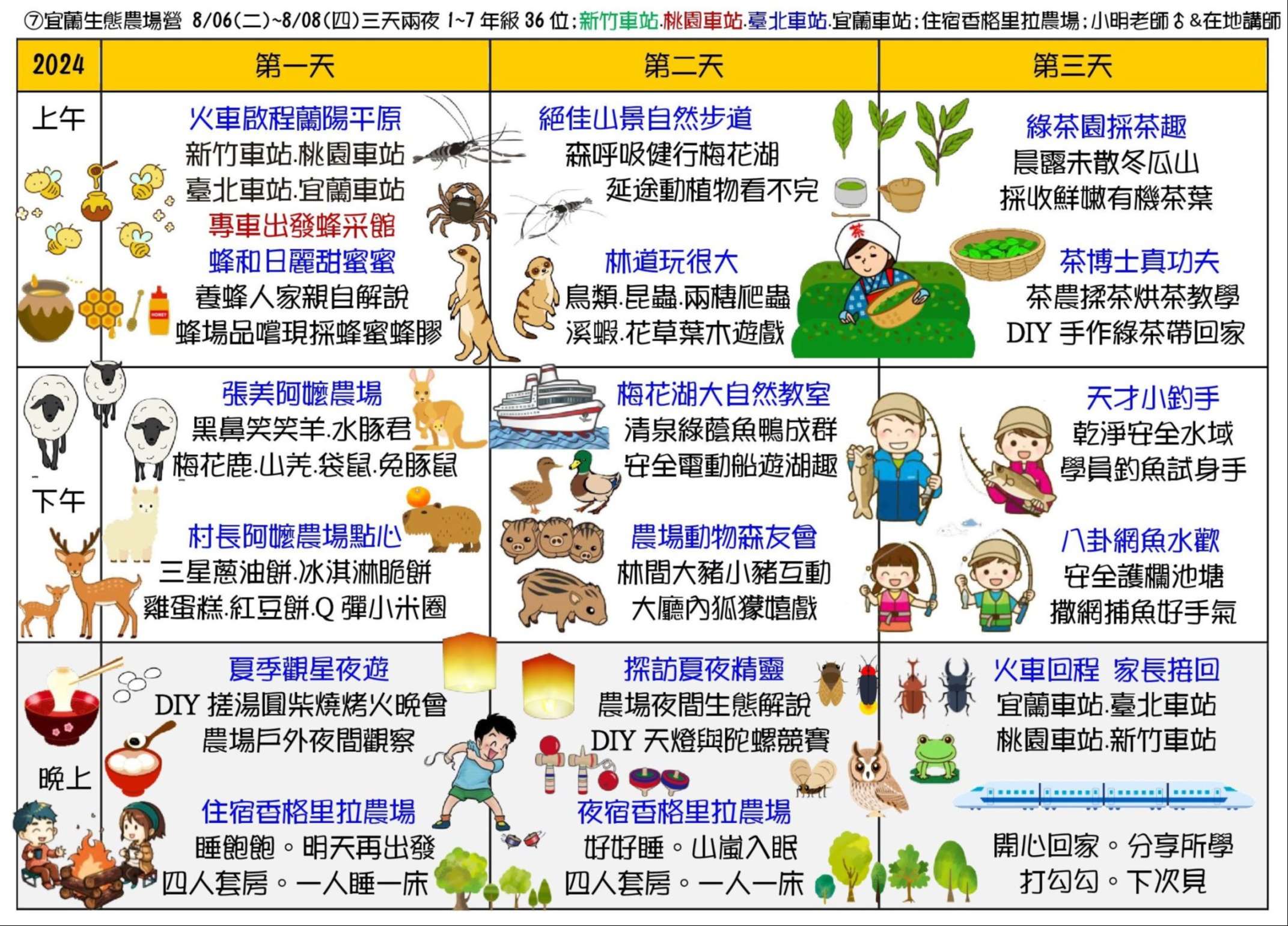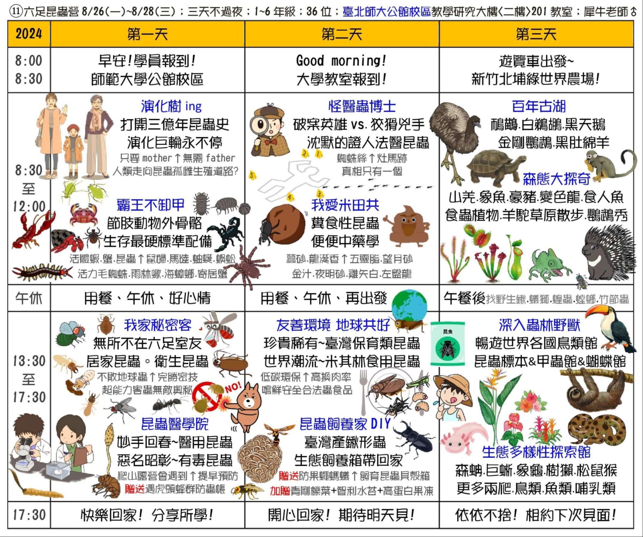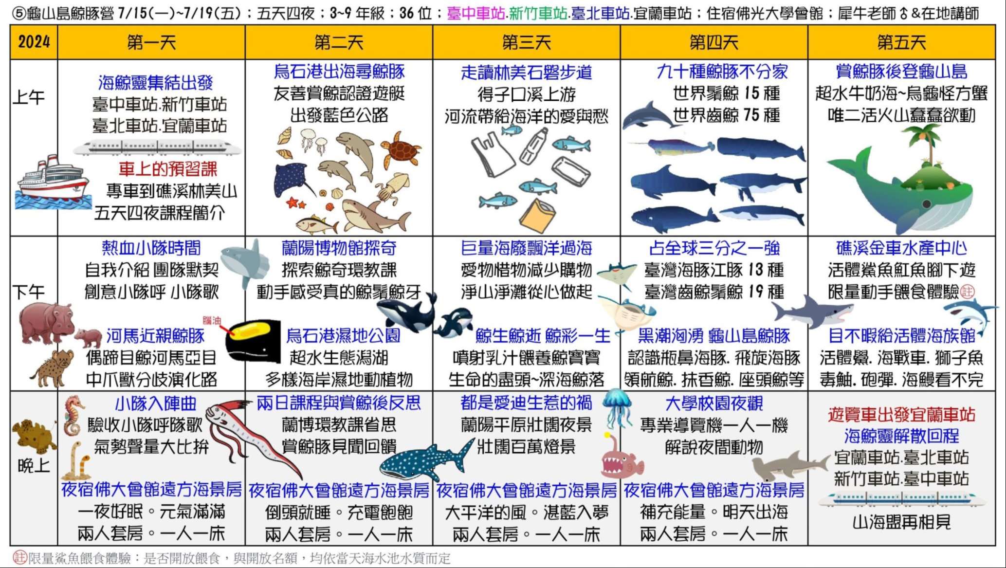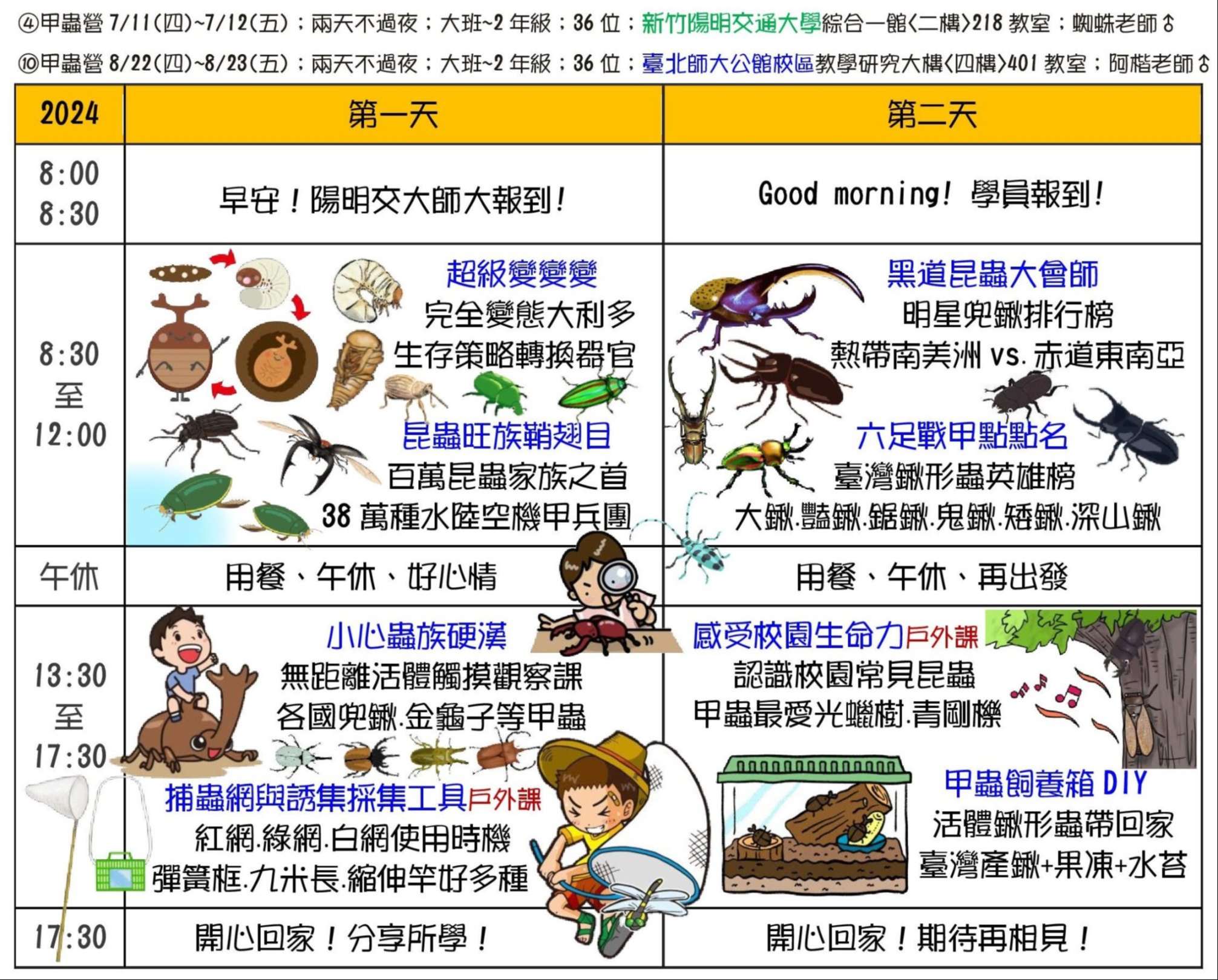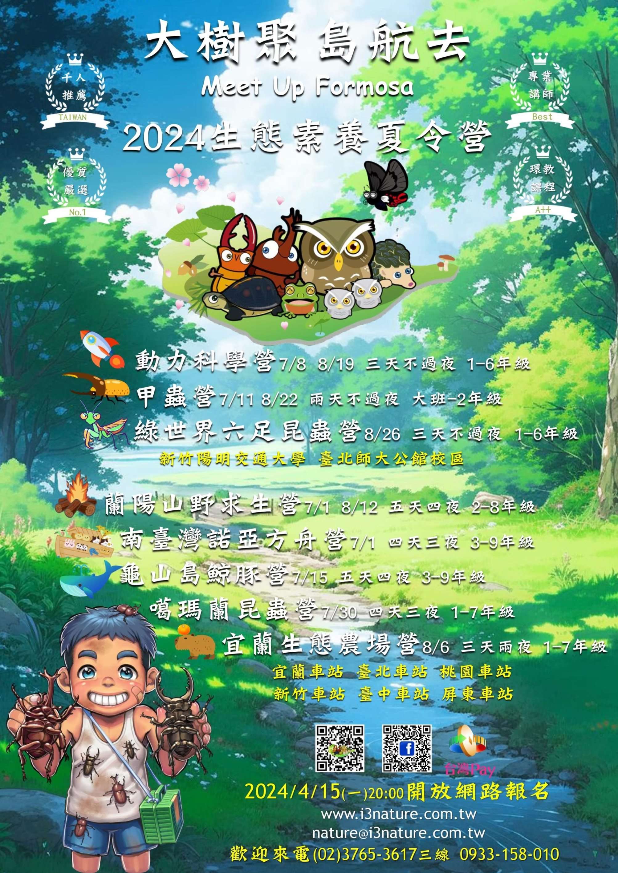 三、課程主題:蘭陽山野求生營、南臺灣諾亞方舟營、龜山島 鯨豚營、噶瑪蘭昆蟲營、宜蘭生態農場營、動力科學營、 甲蟲營、綠世界六足昆蟲營。