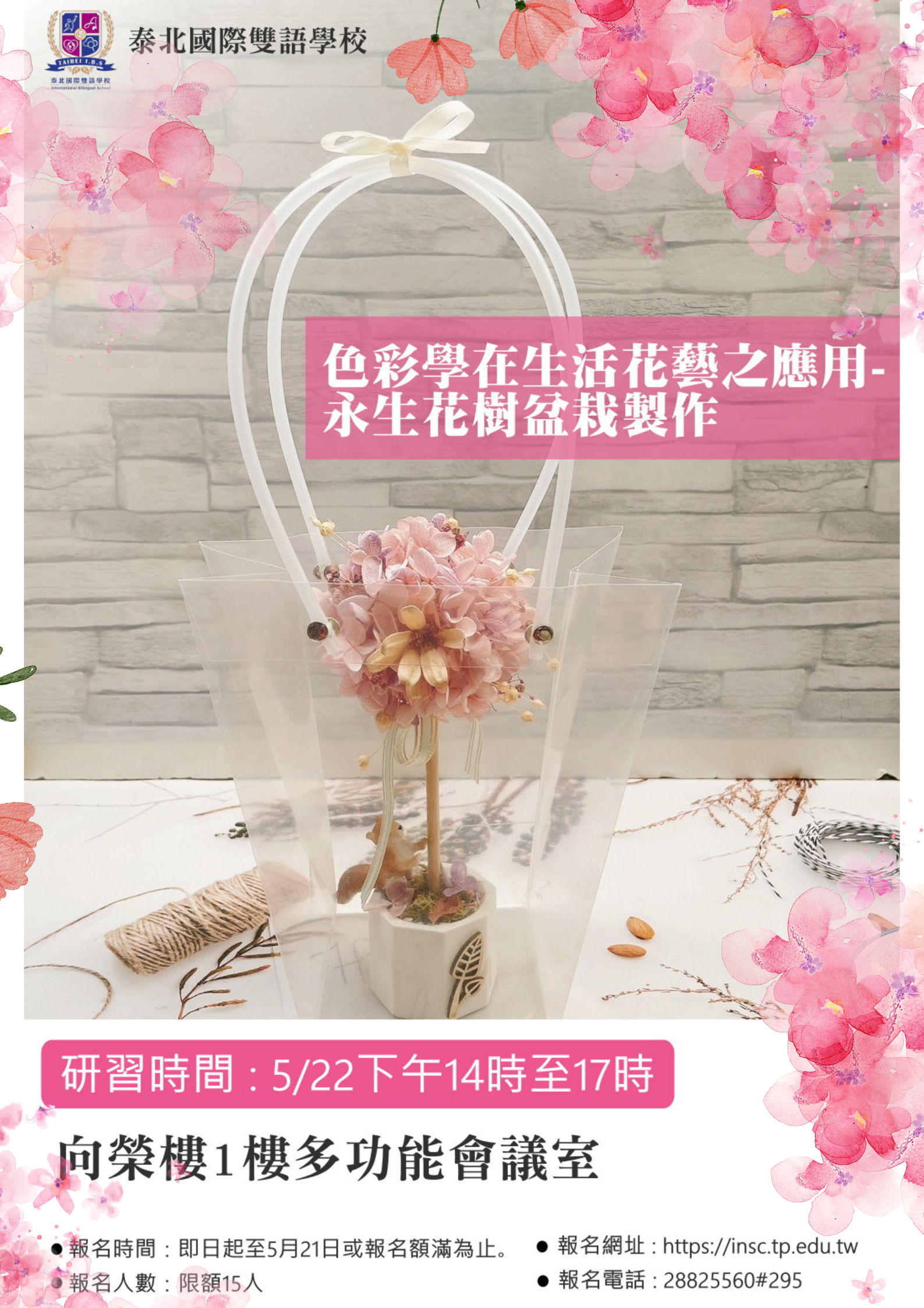 一、課程主題:色彩學在生活花藝之應用-永生花樹盆栽製作。