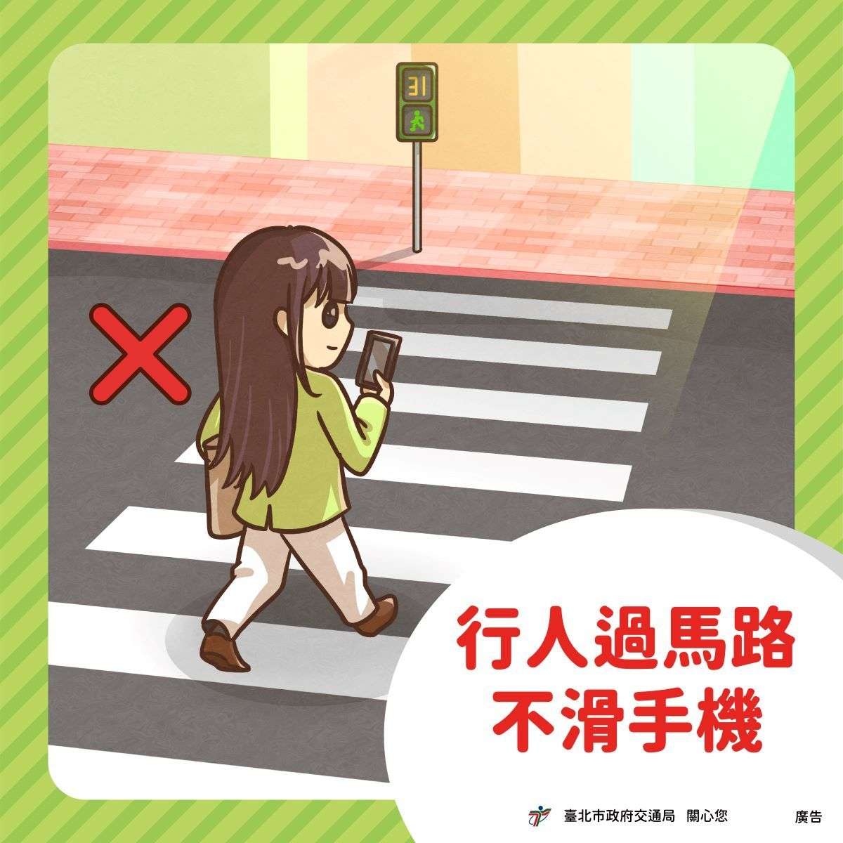 1、依號誌燈號行走 不任意穿越道路 要走行人穿越道。