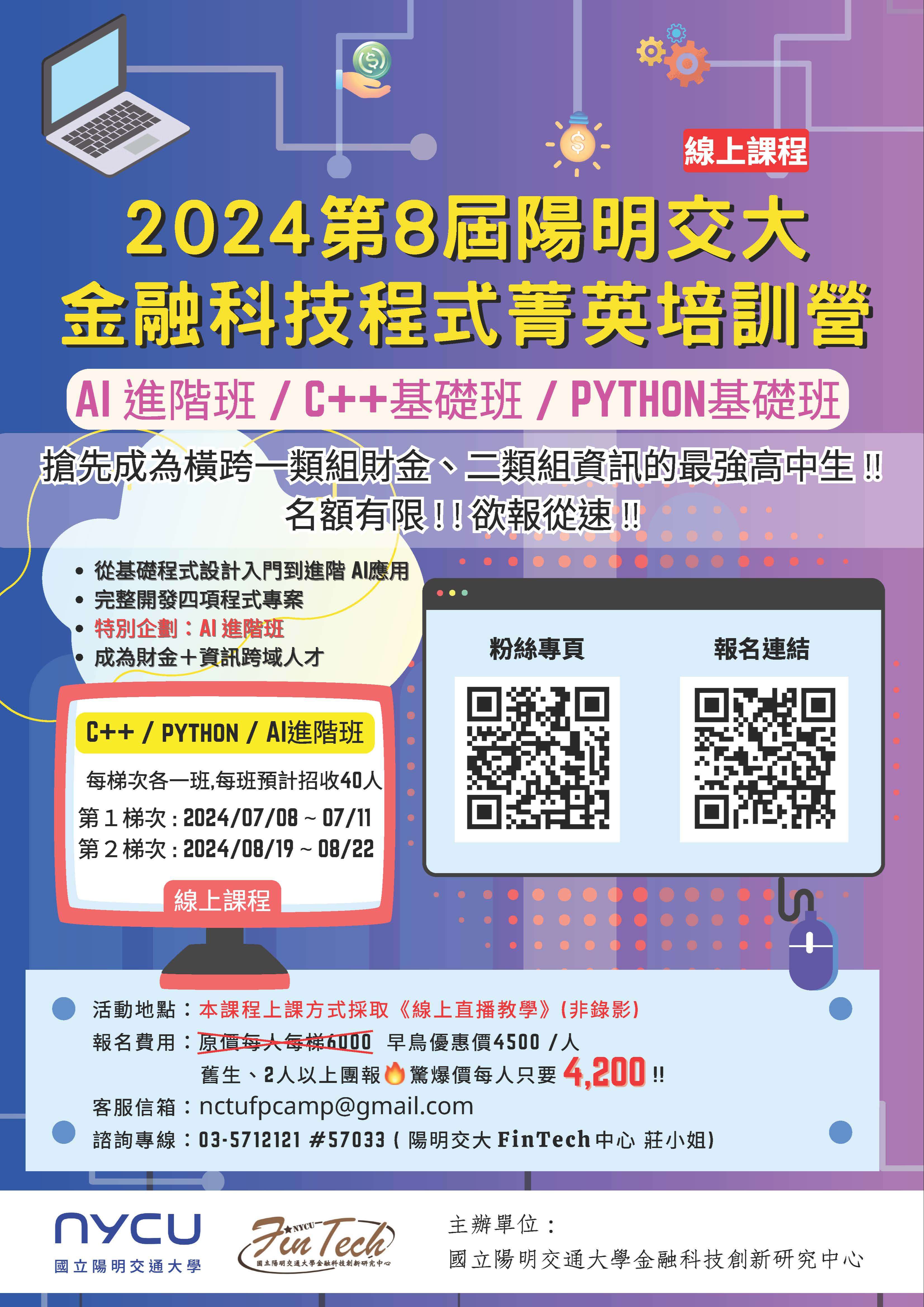 一、2024 「第8屆陽明交大金融科技程式菁英培訓營(線上課程)」藉由豐富有趣的課程規劃、深入淺出教學,輕鬆地學習C++、Python之基本概念與實作技巧。今年特別開辦「AI進階班」,名額有限敬請把握!