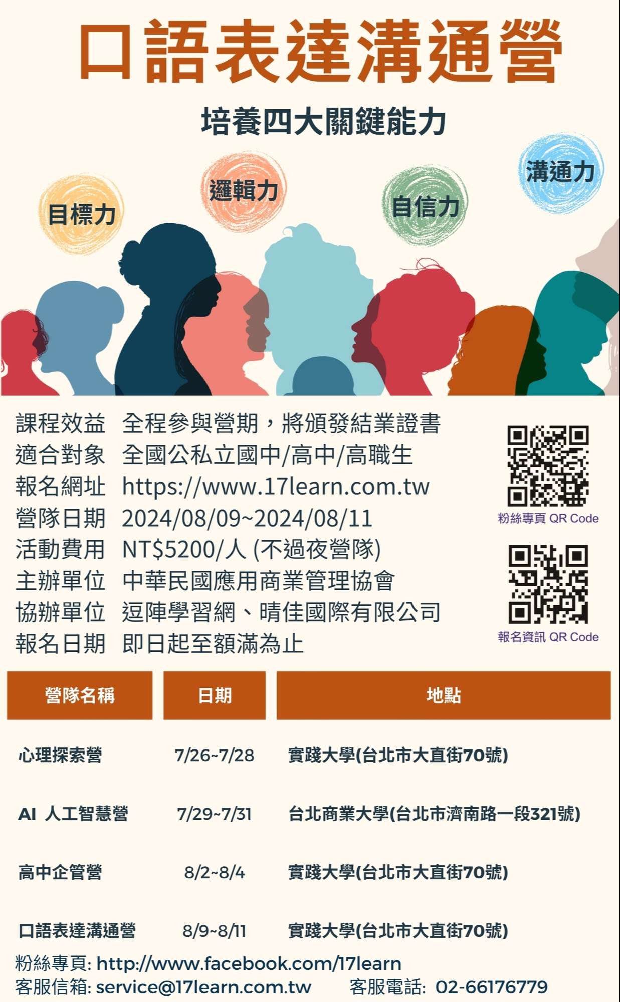 十一、另有:心理探索營、高中企管營、AI人工智慧營多項營隊,歡迎報名參加。