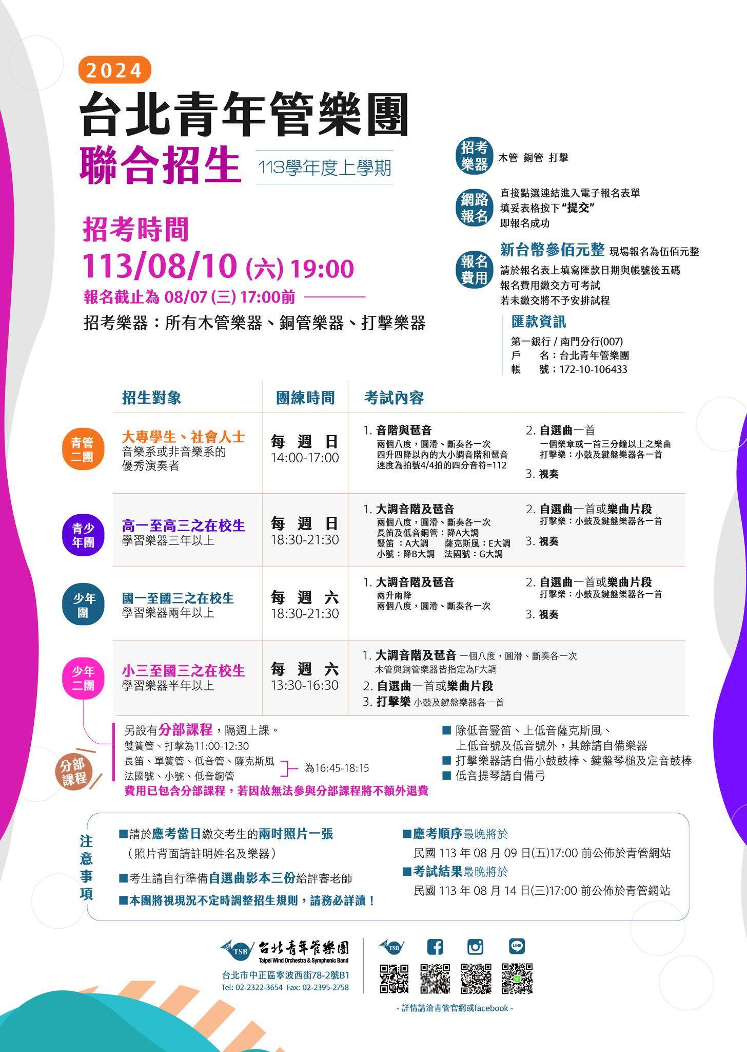 臺北市台北青年管樂團辦理113學年度上學期台北青管附屬團隊招生, 請有興趣者參考。