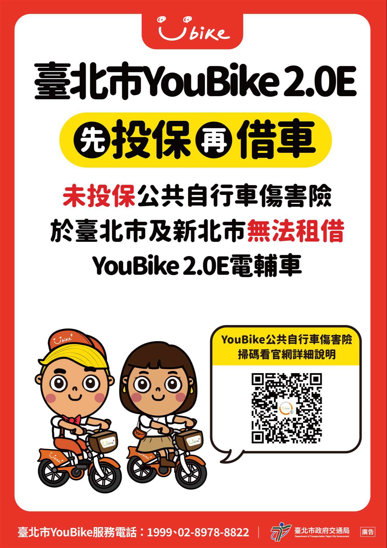 二、查本市規劃於近期陸續引進公共電動輔助自行車YouBike 2.0E,考量其加速快、騎乘距離長等特性,YouBike使用者 須先投保公共自行車傷害險方能租借YouBike2.0E,以提升其騎乘時之保障。