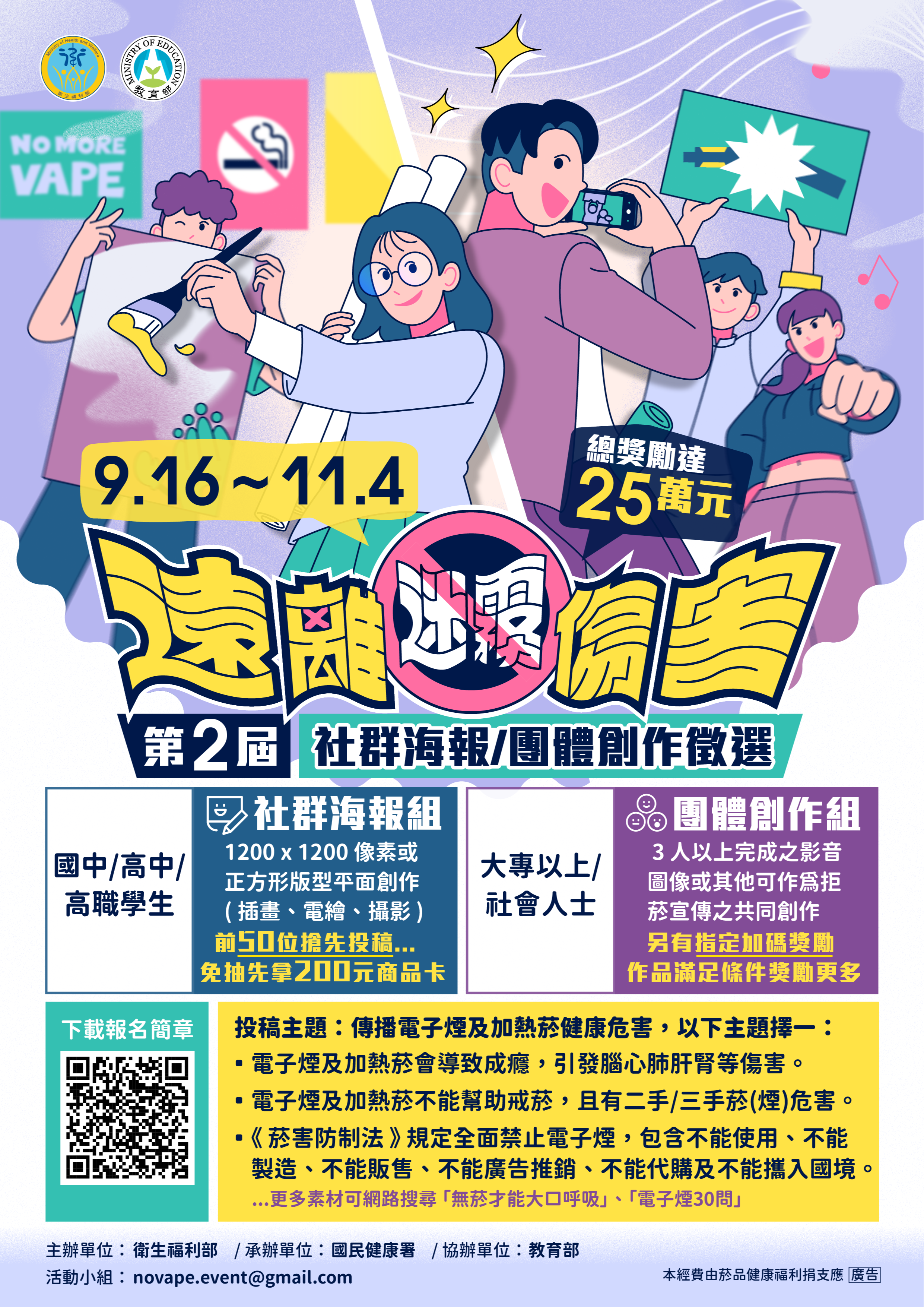 二、為避免電子煙、加熱式菸品等新興菸品入侵校園造成健康 危害,衛生福利部透過旨揭徵選活動宣導電子煙及加熱式 菸品等新類型菸品之危害,共同維護青少年健康。
