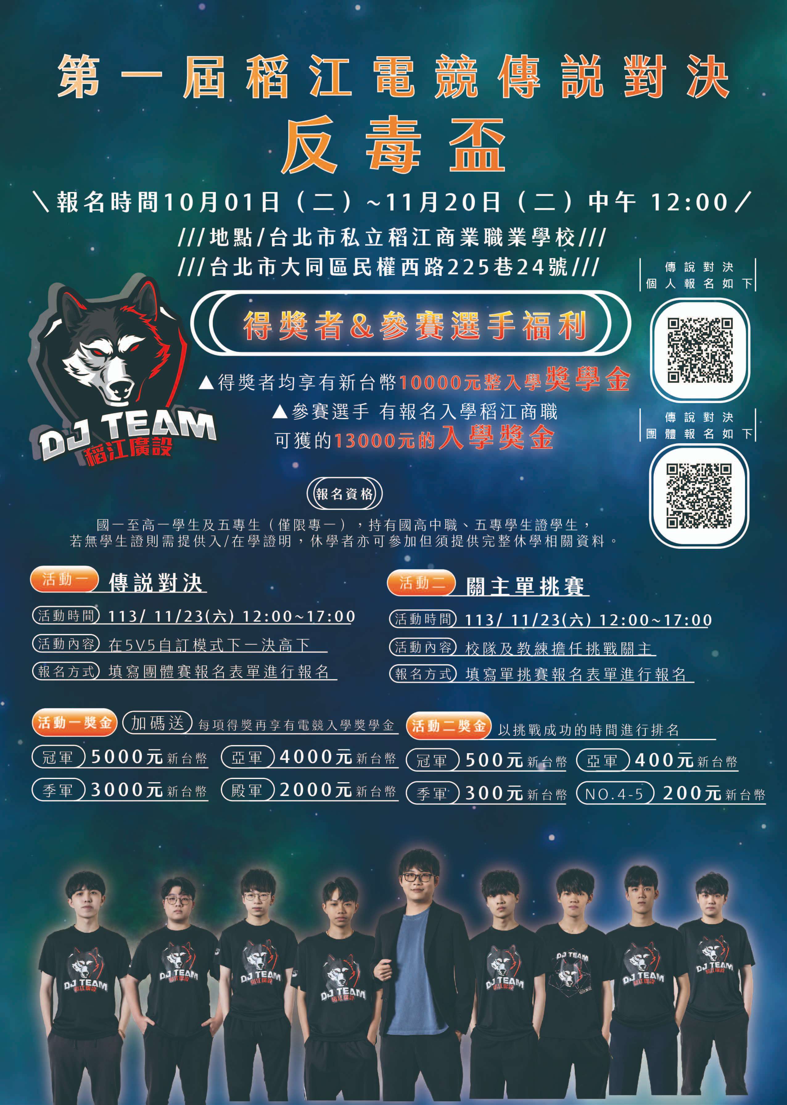 六、賽事注意事項:前往稻江商職廣告設計科粉絲專頁線上報名並加入賽事Discord,請確實填寫報名表之參賽者基本相關資料,如有缺漏者,恕不受理。報名日期自即日起至113年11月20日中午12:00止,隊數額滿即截止報名(視情況超收隊伍)。