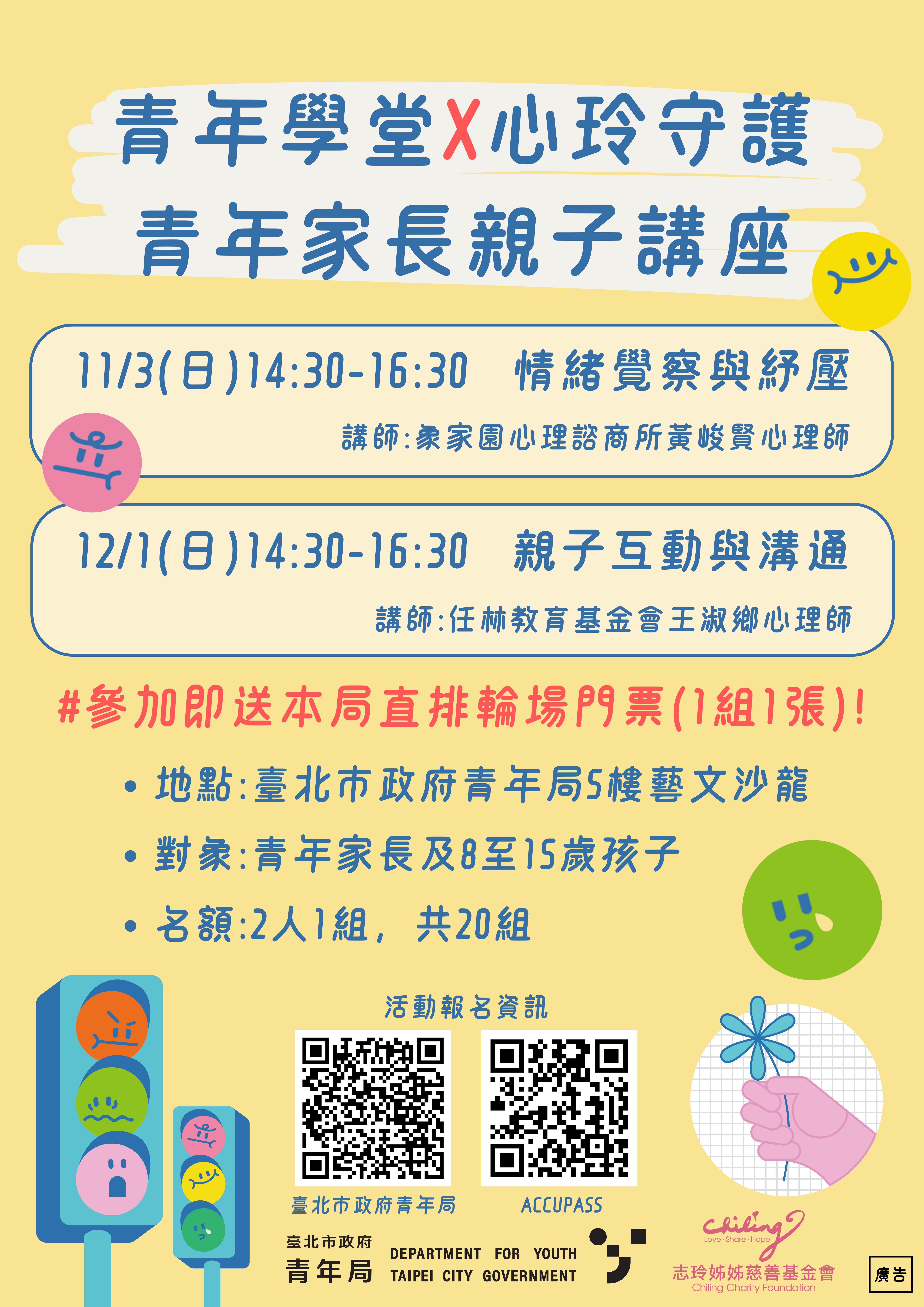 一、臺北市政府青年局為提升青年家長與孩子心理健康知能及抒發情緒正向管道,與財團法人臺北市志玲姊姊慈善基金會合作辦理親子講座,透過心理諮商師帶領親子互動,提供青年家長及孩子認識、覺察與表達情緒的調適方法,期待藉由公私部門協力合作,共同推廣心理健康之重要性。