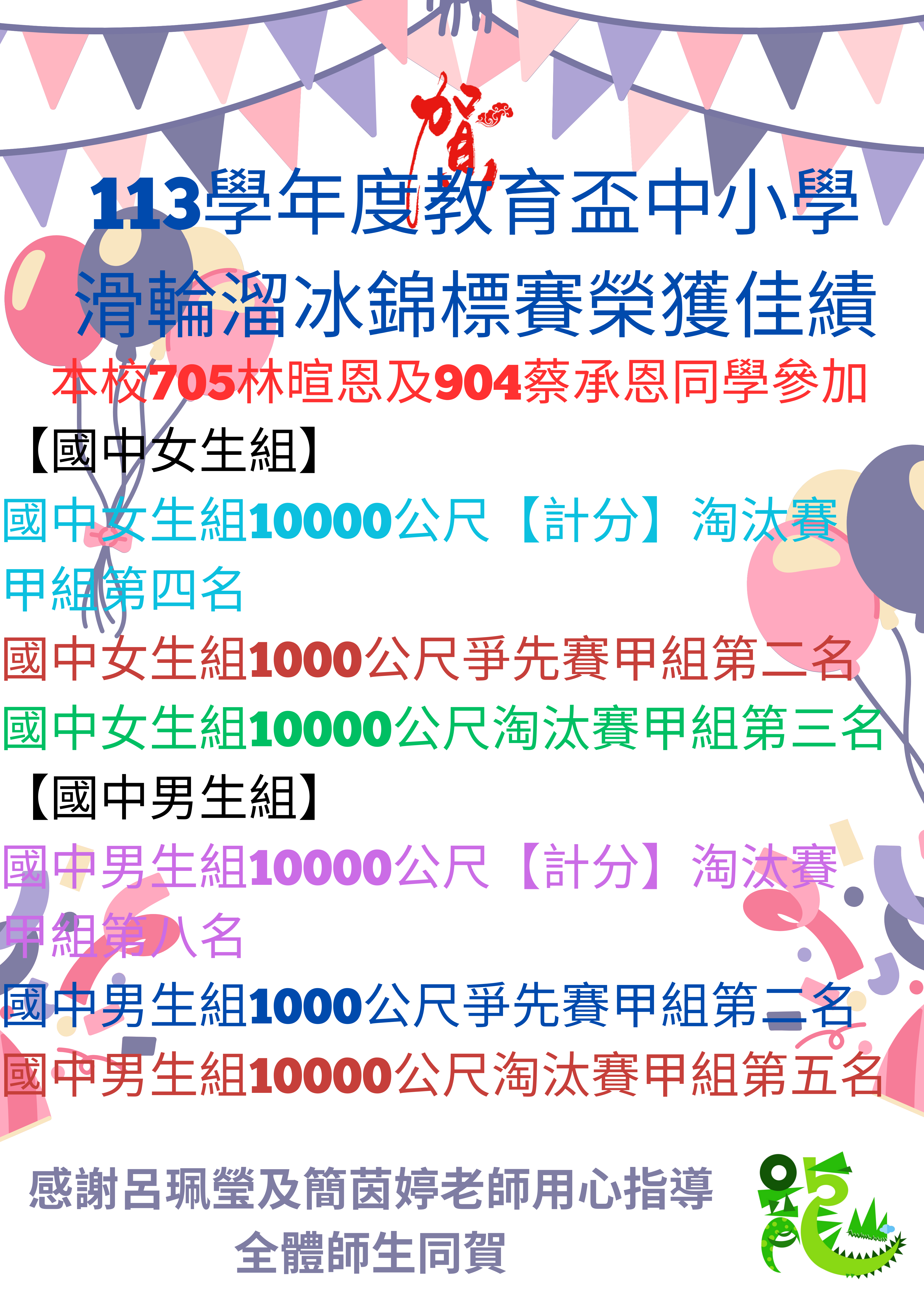 本校參加113學年度教育盃中小學滑輪溜冰錦標賽榮獲