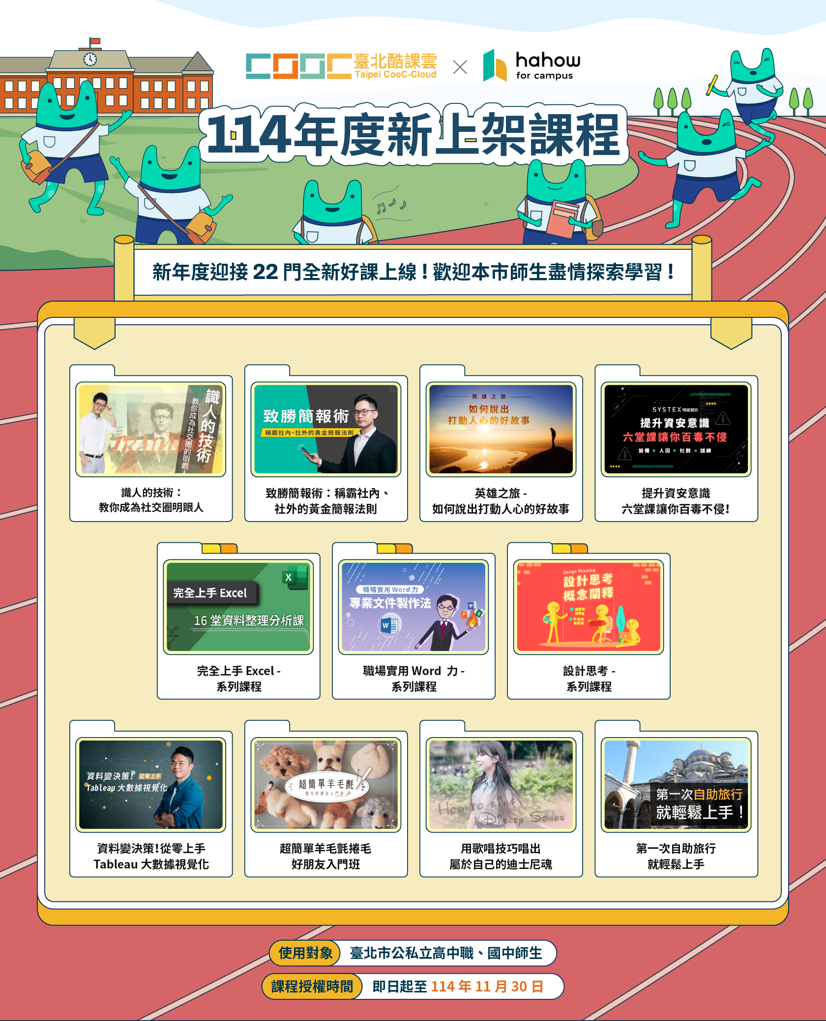 (二)課程授權期限:即日起(114年度新上架課程授權自114 年1月1日起)至114年11月30日止。課程專區:至臺北酷課雲(https://cooc.tp.edu.tw) 使用「臺北市校園單一身分驗證帳號」登入,於「主題 學習專區」點選「Hahow for Campus」即可進入平臺觀 看課程。