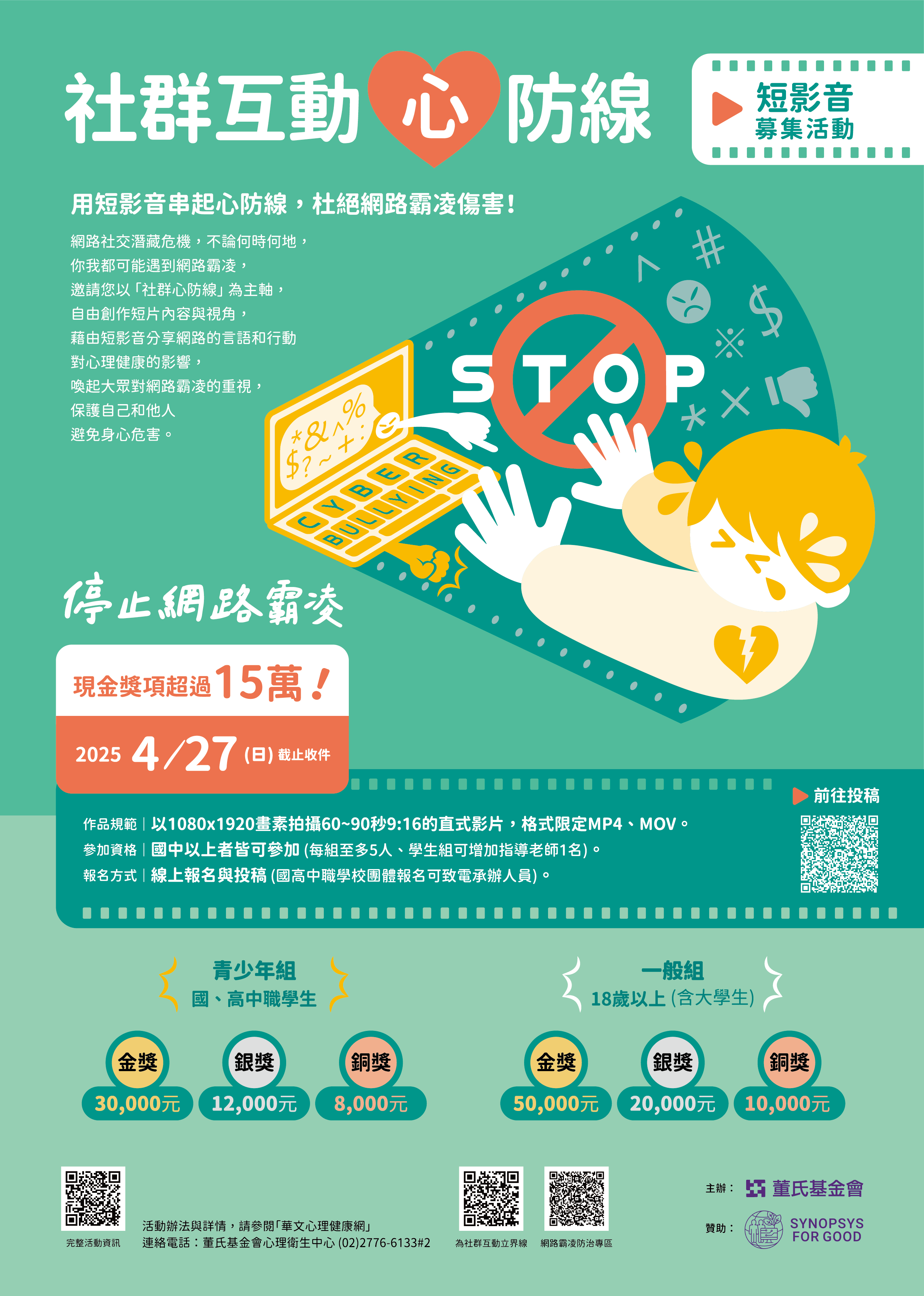 二、為鼓勵青少年透過活動參與了解預防網路霸凌傷害的重要性,本會今年舉辦「社群互動”心”防線」停止網路霸凌短影音募集活動,即日起開始收件至民國114年4月27日 止,邀請學生與民眾拍攝60-90秒直式短影音投稿,得獎作品可獲得獎金,青少年組首獎現金三萬元、一般組現金五萬元。活動辦法請參閱https://reurl.cc/1XRnzQ 。
