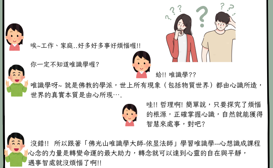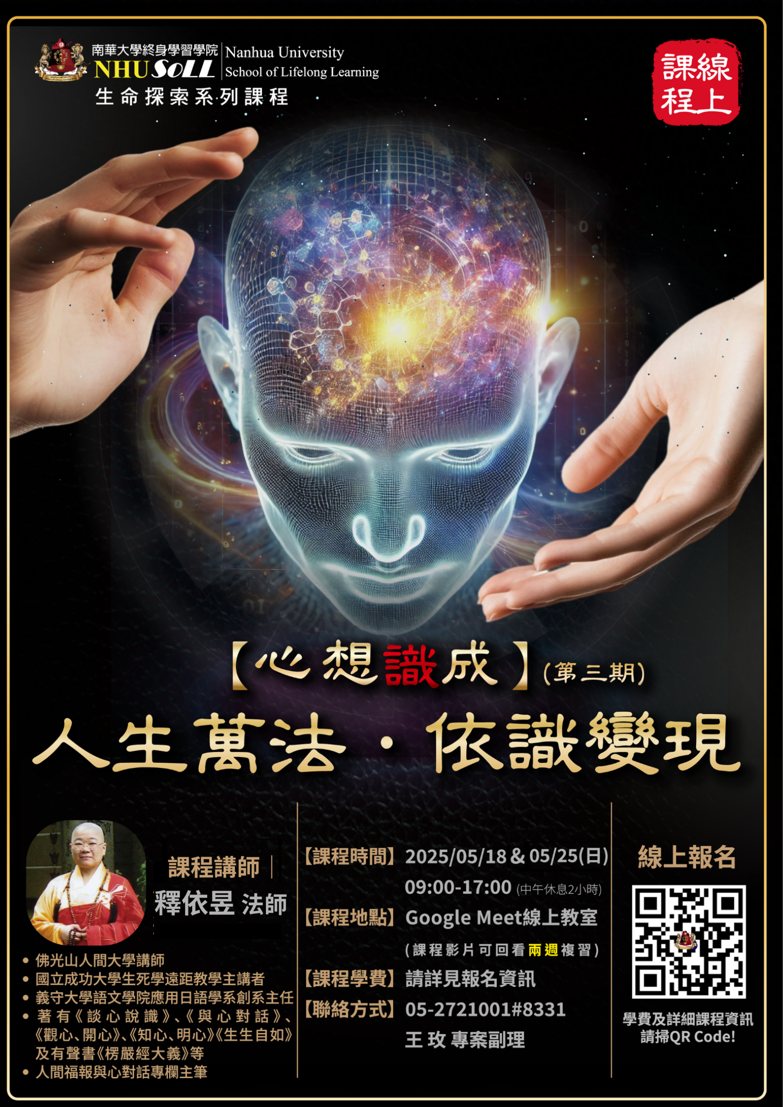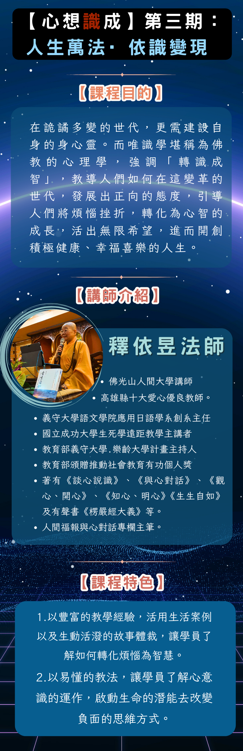 一、為提升大眾應用「唯識學」從而提升自我覺察和身心靈健康,本校終身學習學院特辦理本線上課程,課程講師為佛光山人間大學講師-釋依昱博士,其以精通佛教唯識學之專長,並以生活化淺顯方式,傳授如何運用唯識學技巧:說心、說性、說識、說相,「一切唯心,萬法唯識」…,並引導大眾以佛法轉念成智,獲取心靈的平靜與內在的智慧。