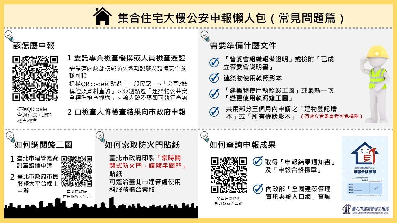 轉知~本市建築管理工程處「集合住宅大樓公安申報懶人包」建管處提醒您,6樓以上住宅納入公安申報對象, 應於114年完成公安申報作業,以免受罰,相關資訊請至 https://reurl.cc/vpMv6N查詢,謝謝。