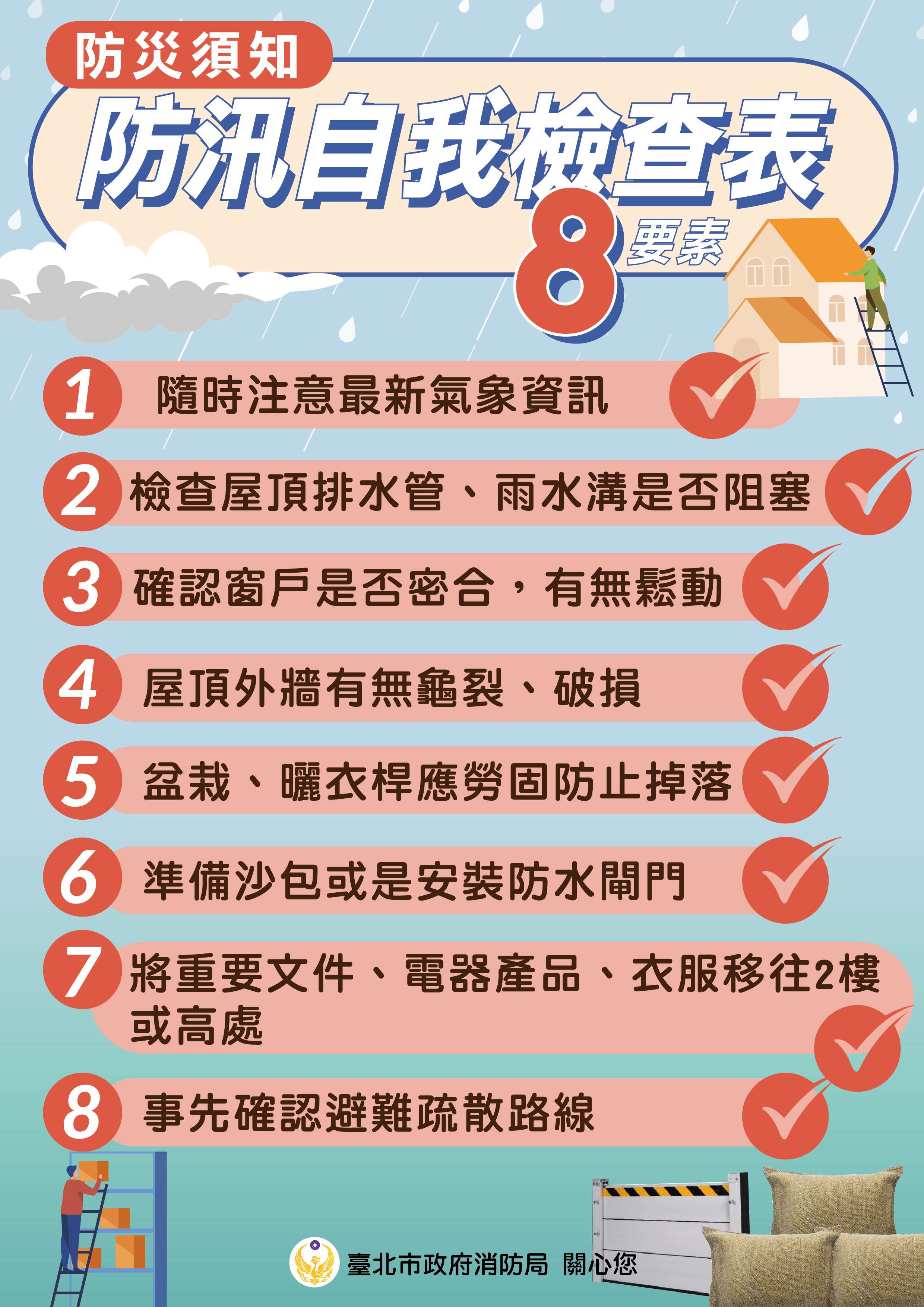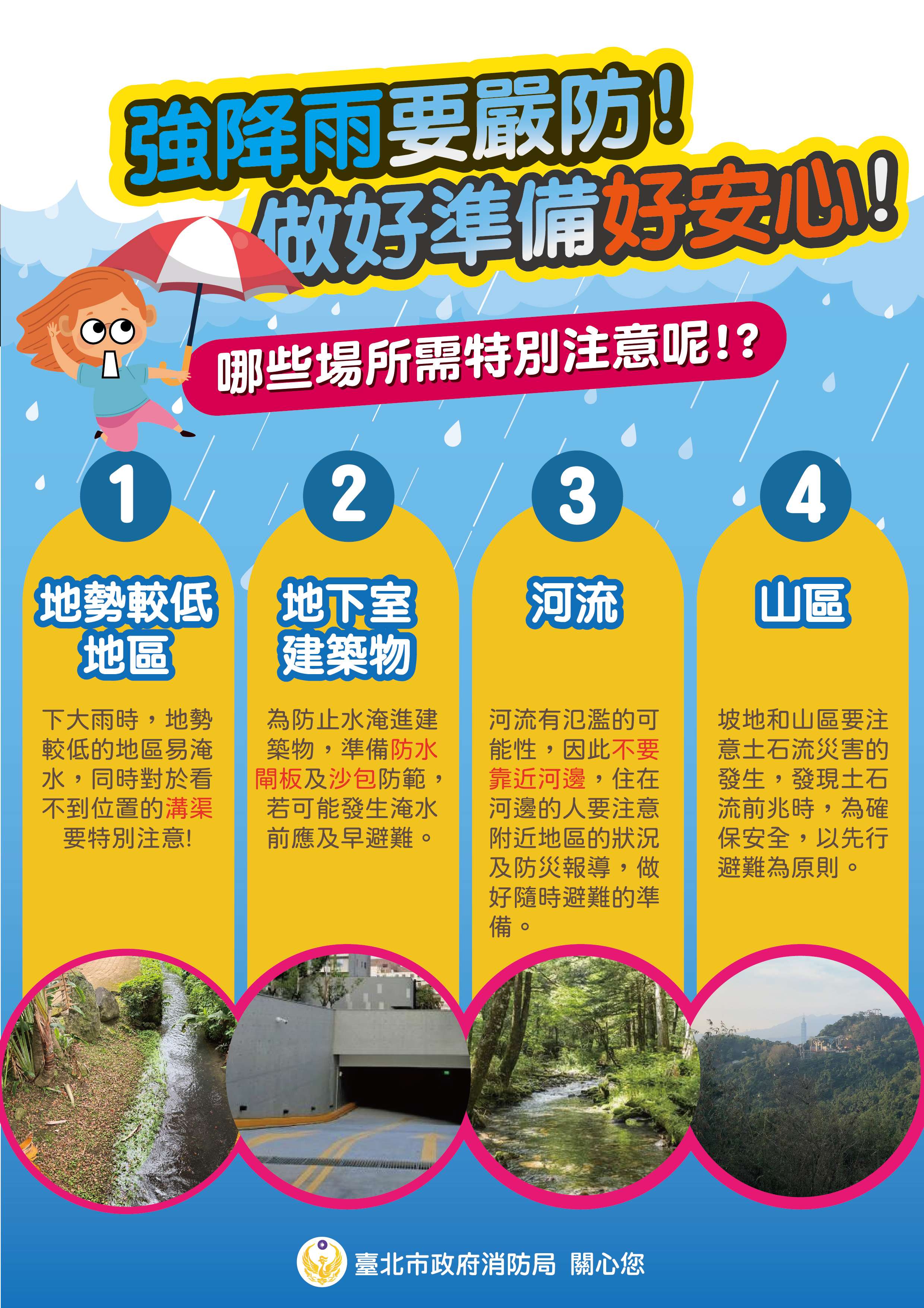 汛期即將來臨,請民眾提前做好清淤排水,注意氣象與災害資訊,提高警覺。若前往山區或河邊等地區,應隨時注意環境變化,如發現任何異常,應馬上撤離,以維生命安全。