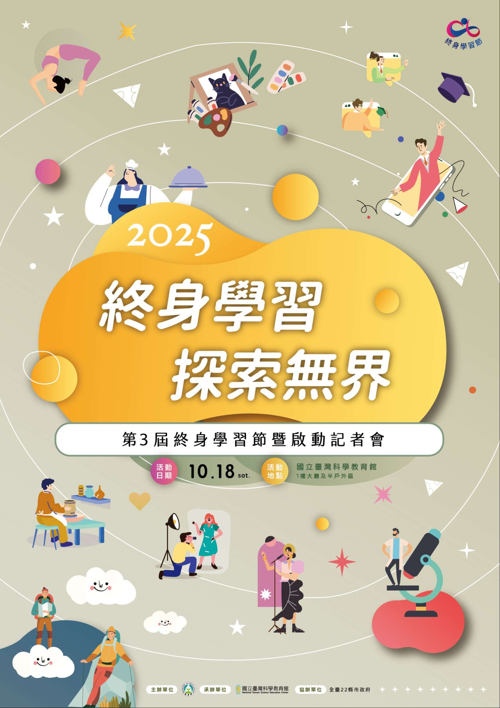 為提升國人終身學習意識,建構終身學習社會,教育部延續112年辦理首屆終身學習節之基礎,特訂於114年10月18日(星期六)假國立臺灣科學教育館辦理教育部第3屆「終身學習節」啟動記者會。本年度活動主題為「終身學習,探索無界」,內容包含啟動記者會、頒獎表揚、終身學習集章市集與工作坊等多元活動。 歡迎民眾踴躍參與!活動資訊若有需詢問事項,可洽承辦單位國立臺灣科學教育館何小姐(電話:02–6610–1234轉1526)。