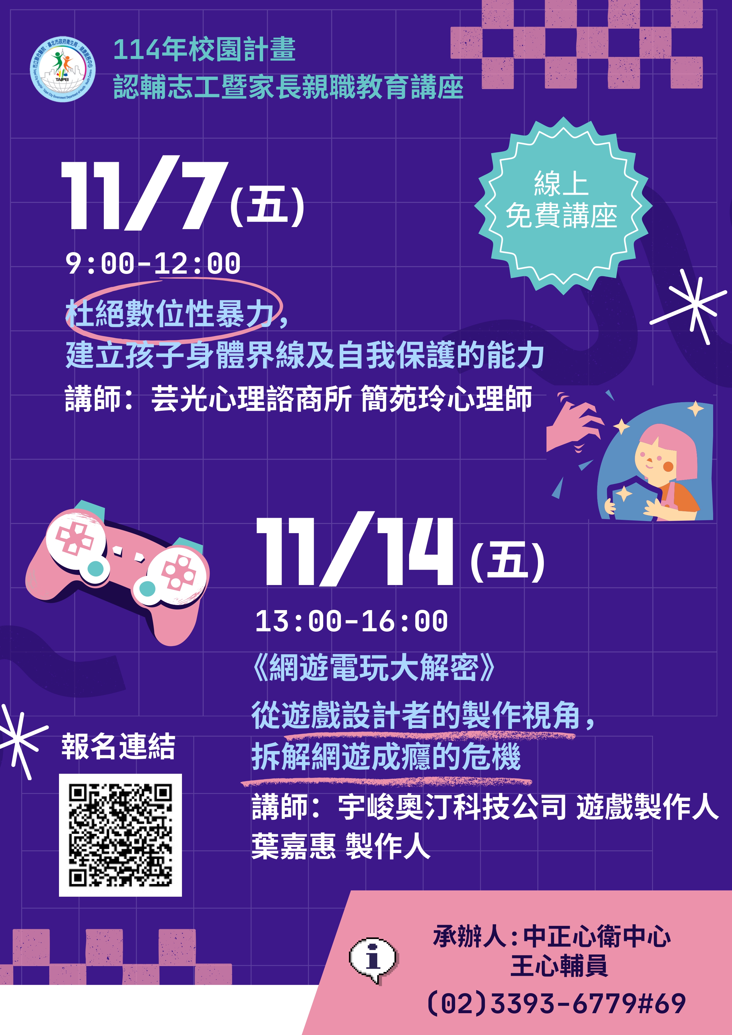 (一)114年11月7日(五)上午9時至12時「杜絕數位性暴力:建立孩子身體界線及自我保護的能力」,講師:芸光心理諮商所簡苑玲心理師。
