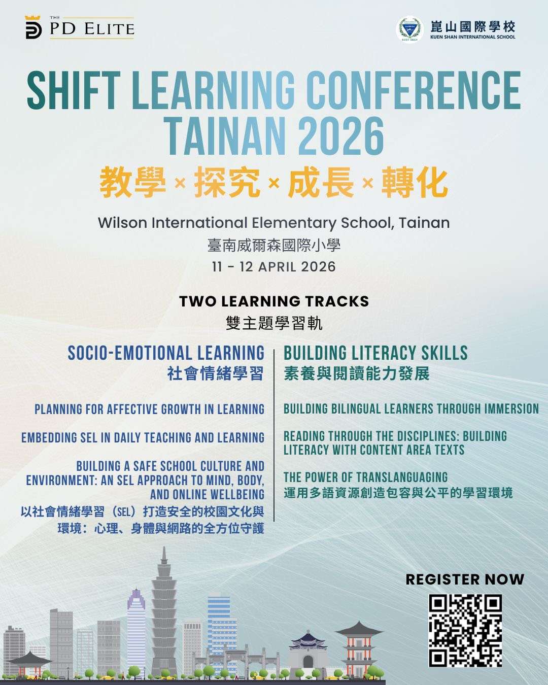 三、本校為促進教師專業發展並引進國際教育專業資源,特與 PD-Elite合作共同辦理《Shift Learning Conference Tainan 2026》國際教育研習活動,研習訂於2026年4月11 日至4月12日於臺南市威爾森國際國民小學(Wilson International Elementary School, Tainan)舉行,為全 臺灣少數為所有學習階段教育工作者辦理的全英語研習, 機會難得。